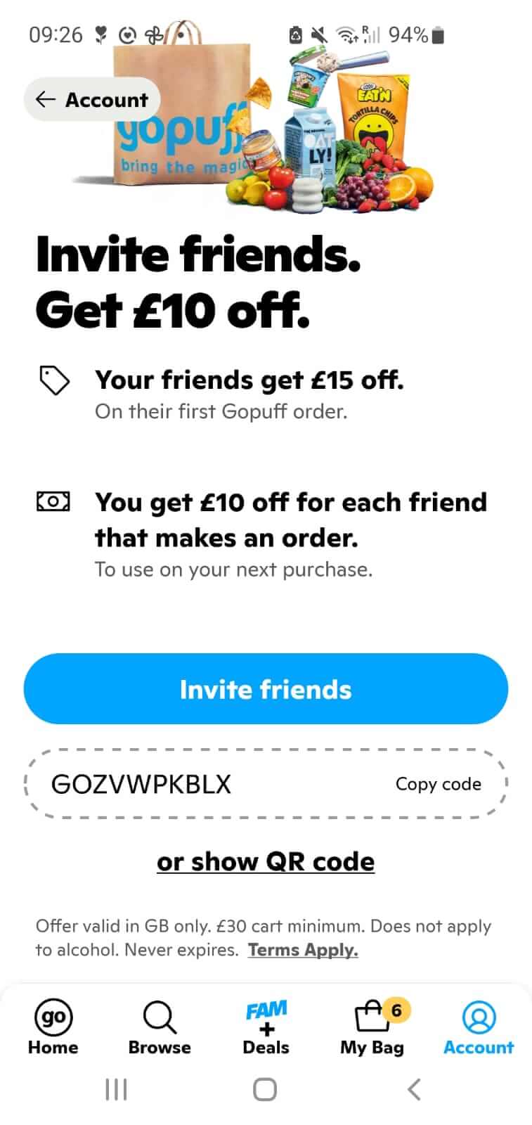 5. Apply the Promo Code: At checkout, enter the Gopuff promo code GOZVWPKBLX to get £15 off your order.